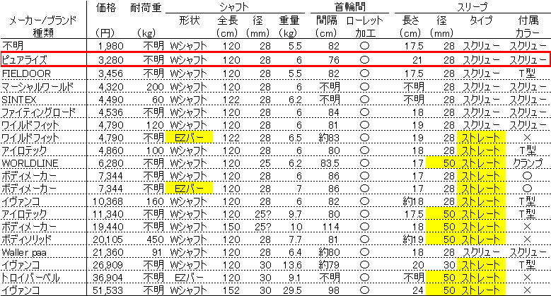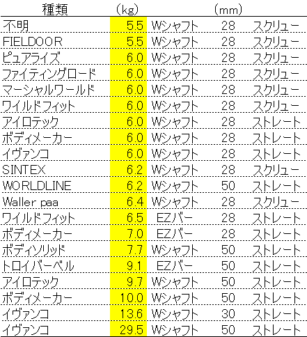 ネットで販売されているWシャフト/EZバーを、耐荷重、シャフト(形状、長さ、径、重量)、首輪間(間隔、ローレット加工の有無)、スリープ(長さ、径、タイプ、付属のカラー)について価格順に並べてみました。