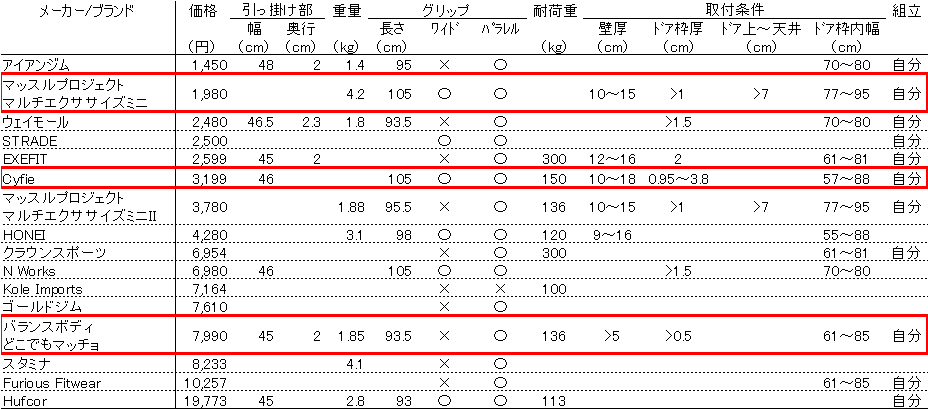 ドアジム(ドア枠にひっかけるタイプ)の比較