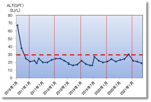 ALT(GPT)の基準値は308IU/L)ですが、肝機能改善のために通院している栗原クリニック東京・日本橋の栗原毅医師から提示されている目標値は、20(IU/L)以下です。2020年の下半期に基準値と同じ30(IU/L)が1度出てしまいましたが、2021年上半期は22、21、19という値で、目標に近づいてはいますが、まだ安定して20(IU/L)以下にはなりません。