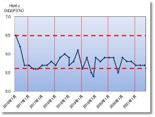 糖尿病は、HbA1c(ヘモグロビンA1c)の値と空腹時血糖値によって判定されます。HbA1c(ヘモグロビンA1c)の基準値は以下のとおりです。HbA1c5.6%未満:正常値5.6〜6.4%:境界型糖尿病6.5%以上:糖尿病型上のグラフは、減量を始めた2016年7月7日から2021年6月30日までのHbA1cの値です。糖尿病と判定される6.5%まで上がることはないのですが、なかなか正常値の5.6%未...