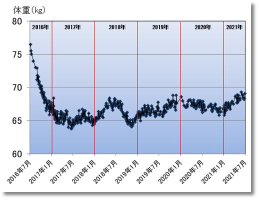 上のグラフは、2016年7月7日に減量を開始してから2021年6月30日までの、約5年間の私の体重推移を追ったものです。昨年の2020年は、新型コロナウィルスが日本でも広がり始めた年初から、たんぱく質の接種量不足と運動不足が重なり、年末に向けて体重が徐々に減って行ってしまいました。そこで一転、2021年は年初から食事量を意識的に増やして、筋肉量を元に戻すようにしました。その結果、2021年の上半期...