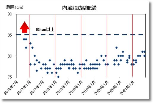 メタボリックシンドロームは、内臓脂肪型肥満、いわゆる腹囲による必須項目と、高血糖、脂質異常、高血圧という3つの選択項目で判定されます。既にメタボを脱して数年経ちましたが、今年も項目ごとにメタボ判定していきたいと思います。必須項目内臓脂肪型肥満内臓脂肪型肥満は、上のグラフのように腹囲、つまりお腹周りの太さによって測定されます。これはメタボ判定基準の必須項目で、男性の基準値は85cmです。2021年は...