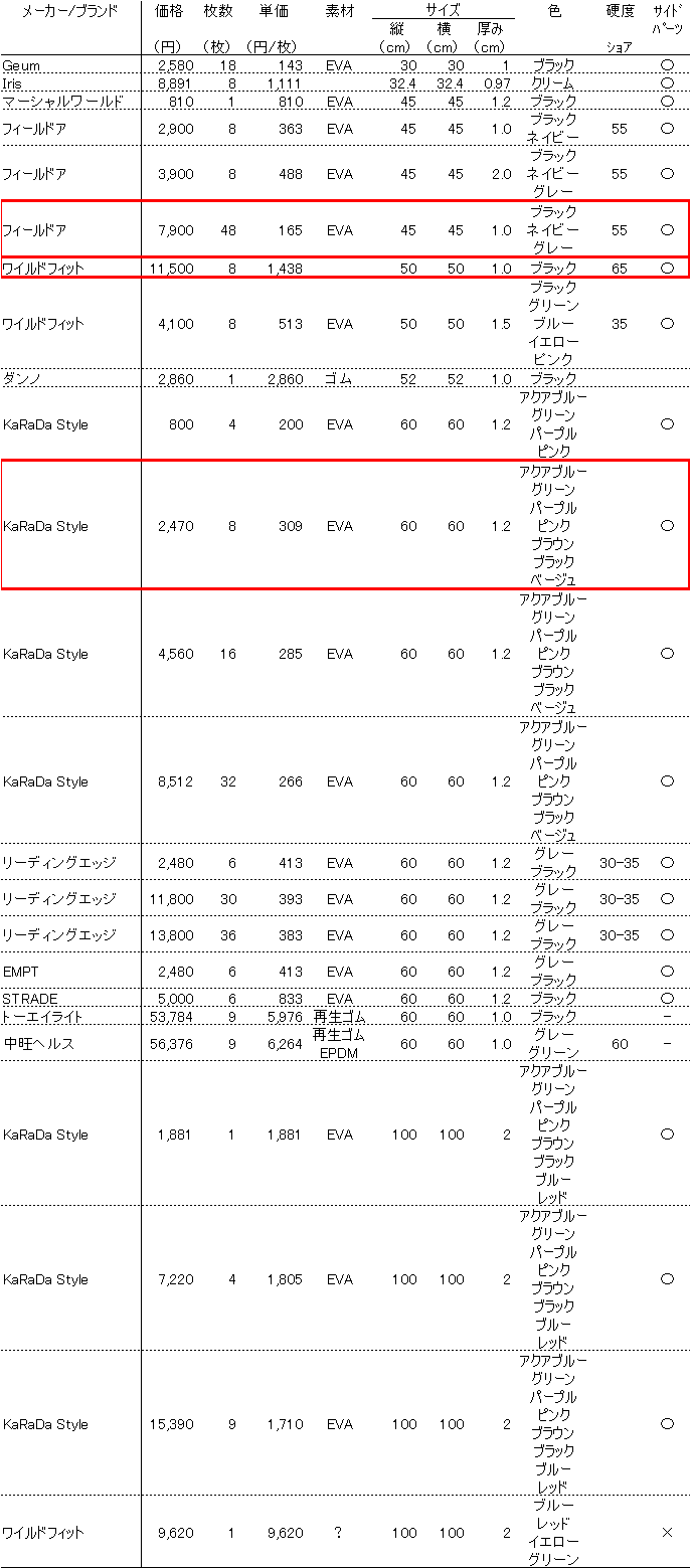 様々な枚数の組み合わせで販売されているので、1枚当たりの単価を参考までに載せています。やはり発泡EVAと比べると、再生ゴム製マットの値段は1桁高くなります。