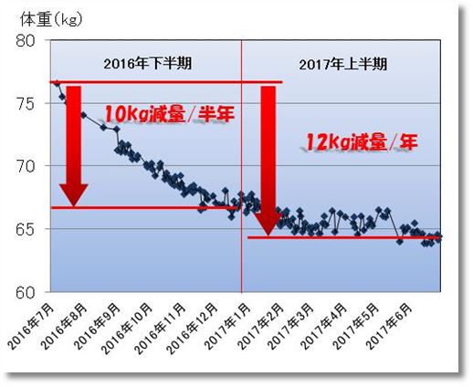 本格的な減量を開始してから、早1年が経過しました。ドクターから糖尿病宣言を受けたのが、2016年7月7日。実際には完全な糖尿病判定ではなく糖尿病型だったわけですが、それをきっかけに食事管理と筋トレによる減量を今でも継続しています。まずは、この1年間の体重変化を追ってみます。ご覧のように2016年の下半期では10kg減量できましたが、2017年上半期では2kgしか減っていません。最初の半年はしばしば...