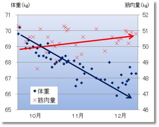食事制限だけで減量していくと、脂肪だけでなく筋肉も落ちてしまいます。カッコ悪いですよね〜では筋肉を維持したまま、脂肪だけ減らすのは可能なんでしょうか?できます。というか、できました。こちらをご覧ください。上が、体重変化と筋肉量の変化を示したグラフで、下が、体重変化と脂肪量の変化を示したグラフです。青の体重変化は、同じです。体脂肪率や筋肉量も測定できる体重計を買ってから3ヶ月間の結果ですが、ね?筋肉...